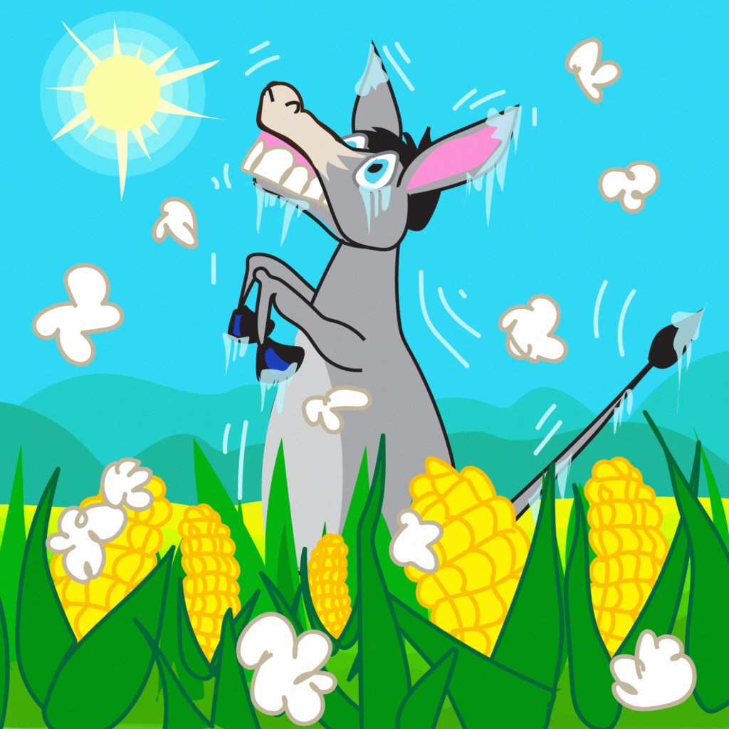 „Да се рика или не? Прашање е сега!“ си мислеше магарето сред летната жега. „Пекол е животов, или пак рај е?“ чекореше тој, не знаејќи кај е. Завеано барајќи за мислите сенка, заталка тој во поле со пченка. Наоколу: жолта, бескрајна шир – од глетката тој си изгуби мир! И тогаш од жешкото пченката пукна: од пуканките бучава стравотна букна. „Што ли е ова? Сред лето снег врне?“ изусти тој пред од страв – да се смрзне.
