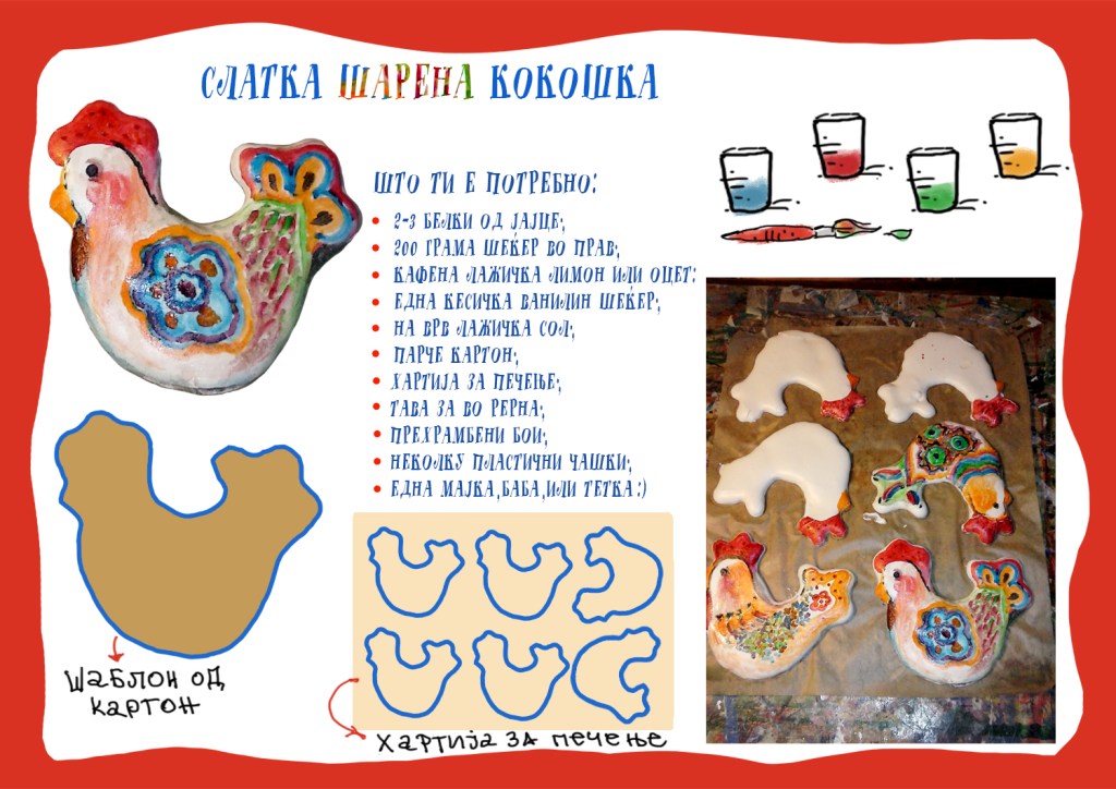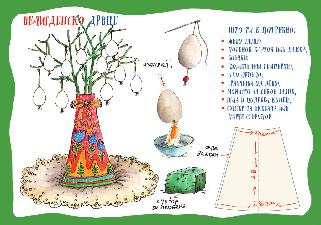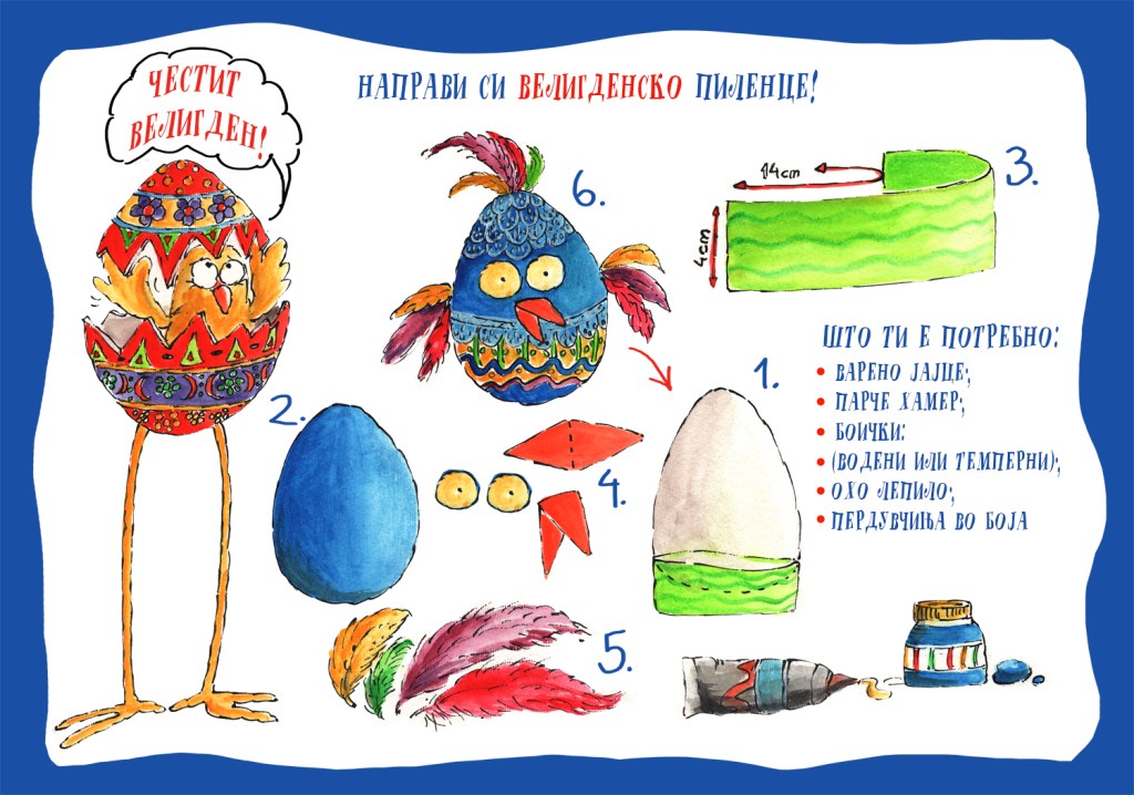 Како да направите сами: 1. Велигденско дрвце; 2. Пиленце од јајце; 3. Слатка шарена кокошка; 4. Коковче – држач за јајце погледнете во активностите на илустраторката Наташа Костовска.