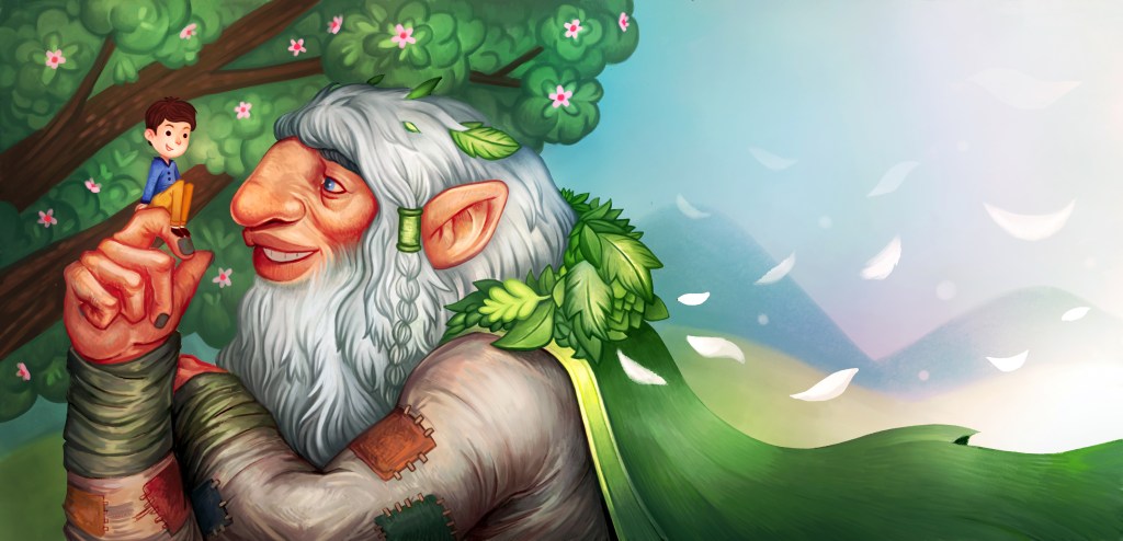 „Но, каде е вашиот малечок другар?“ праша Џинот. „Момчето што го ставив на дрвото.“ Џинот најмногу го сакаше малото момче затоа што го бакна.