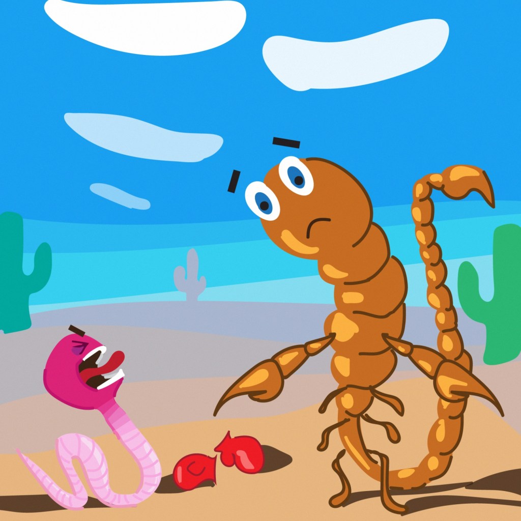 Си бил еден горд, вознемирен црв. На сите им врескал „во сè сум јас прв! Мислите мал сум, ме викате ’црв’!? Бујрум кај мене, ќе падне и крв! На кого ли тука му е од мене трт? Елате овде! Се борам до смрт!“ Се дуел, се силел, се пенавел тој, па ја викнал скорпијата на мегдан, на бој. „Страшна си ти, со опаш со боцка? Дури око да трепне јас ќе те скоцкам! Дојди бре, акреп! Ќе јадеш ти бокс! Ќе ти го скршам тој грд и невидлив нос!“ И ракавици црвот за бојот си земал. Ама изгубил. Оти, раце тој немал.