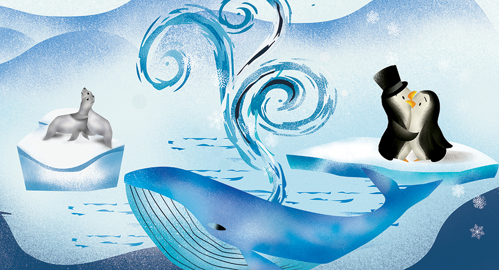 На студените глечери Црно-белите пингвини (Во костуми најсвечени) Прават балови во зими. Среќни како мед во грне Пингвините в пар се клатат (Во ритам на снег што врне) Еден друг бавно се пратат. Заедно со пингвините И китовите се вртат (Со фоките и рибите) Ко да танцуваат првпат. (Вртејќи околу игла) Цела Земја валцер игра.
