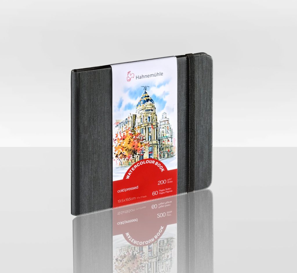 Hahnemühle Watercolour Book е совршен придружник за професионалните уметници но и за сите ентузијасти кои сакаат да сликаат во природа, во урбан пејзаж или додека патуваат. Природната бела 200 грамска хартија има ситнозрнеста структура од двете страни и идеално се отвара – што ја прави совршена за работа со повеќе водени техники и за сликање панорами. Нотесите во повеќе димензии (19×19, 14×14, A6, A5 и A4 – во хоризонтална и вертикална варијанта) имаат 60 страници (30 листа), издржлив тврд повез и еластична лента.