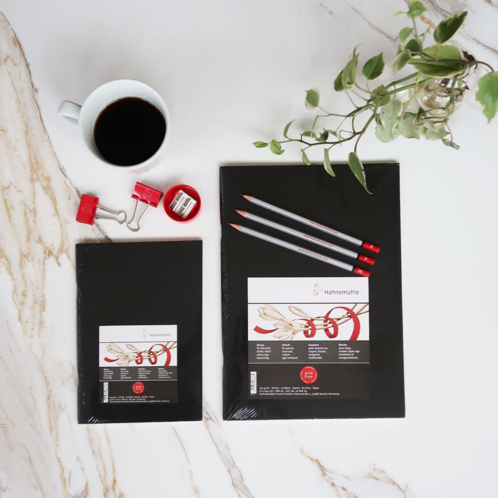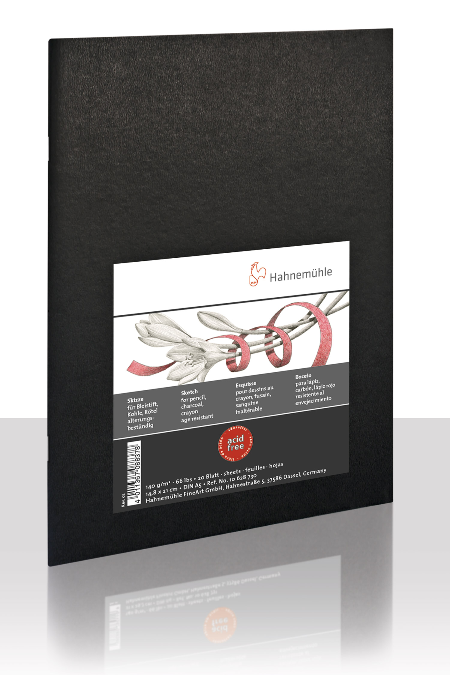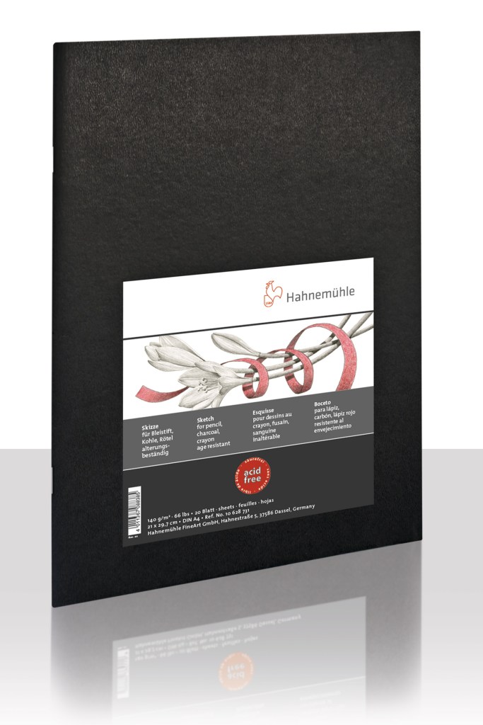 Hahnemühle Sketch Booklet Black е нотес што служи како секојдневен придружник на оние кои сакаат едноставна елеганција, флексибилен и тенок за да можете да го ставите секаде и лесно да го транспортирате. Беж хартијата со суптилно груба текстура од 140 грама е соодветна за цртање со молив, јаглен, црвена креда, како и дрвени бои и пастел. Има 40 страници и достапен е во А5 и А4 формат.