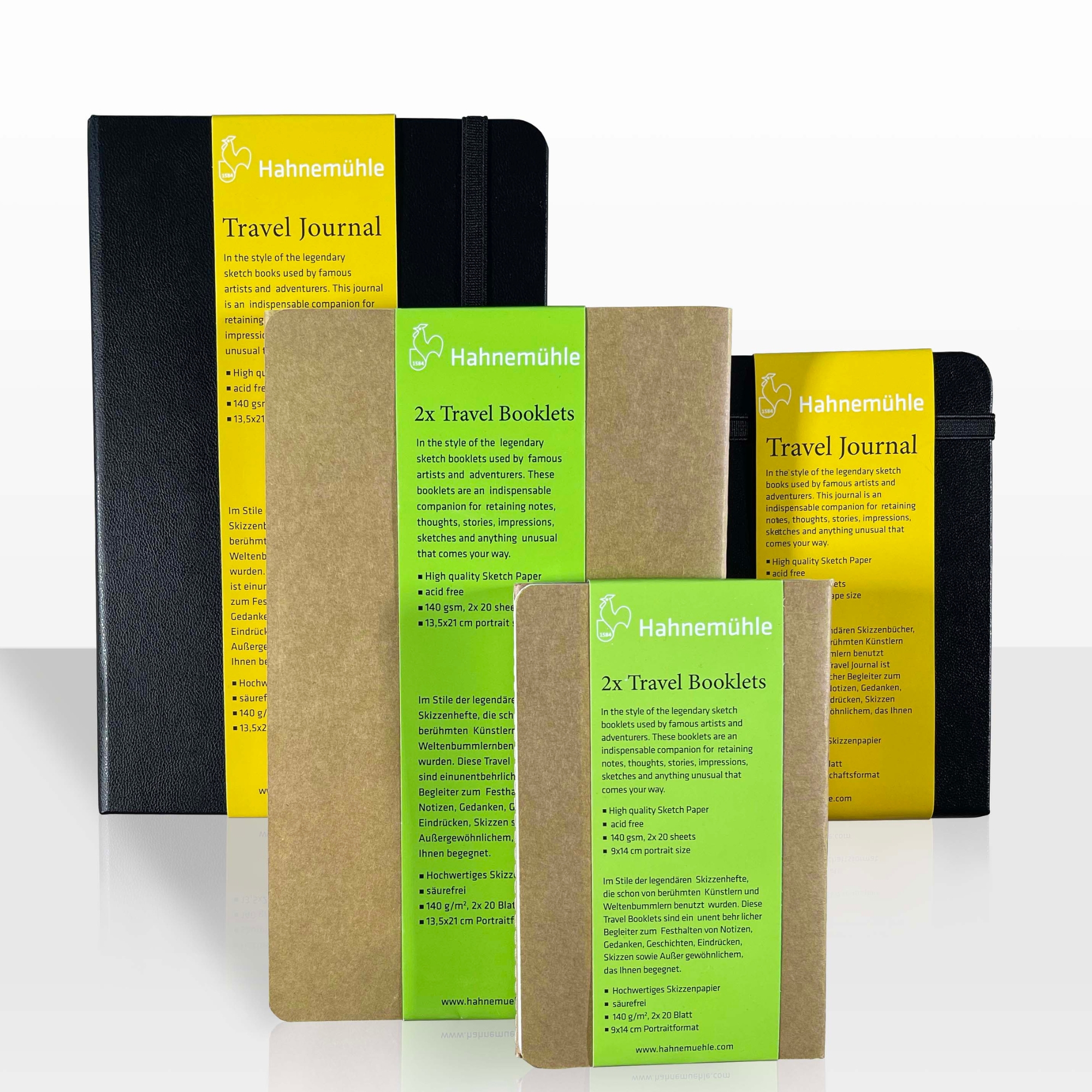 Совршени за сите патници и мобилни уметници кои сакаат да ги визуелизираат или запишат своите размислувања, чувства и впечатоци. Достапни во два формати – 9 x 14 см и 13,5 x 21 см, во хоризонтална и во вертикална варијанта, со 140 грамска хартија за скицирање со нежна структура. И дневниците и буклетите имаат и џеб на задната корица – за собирање на сите фотографии или други „вредни“ нешта што треба да бидат сочувани.