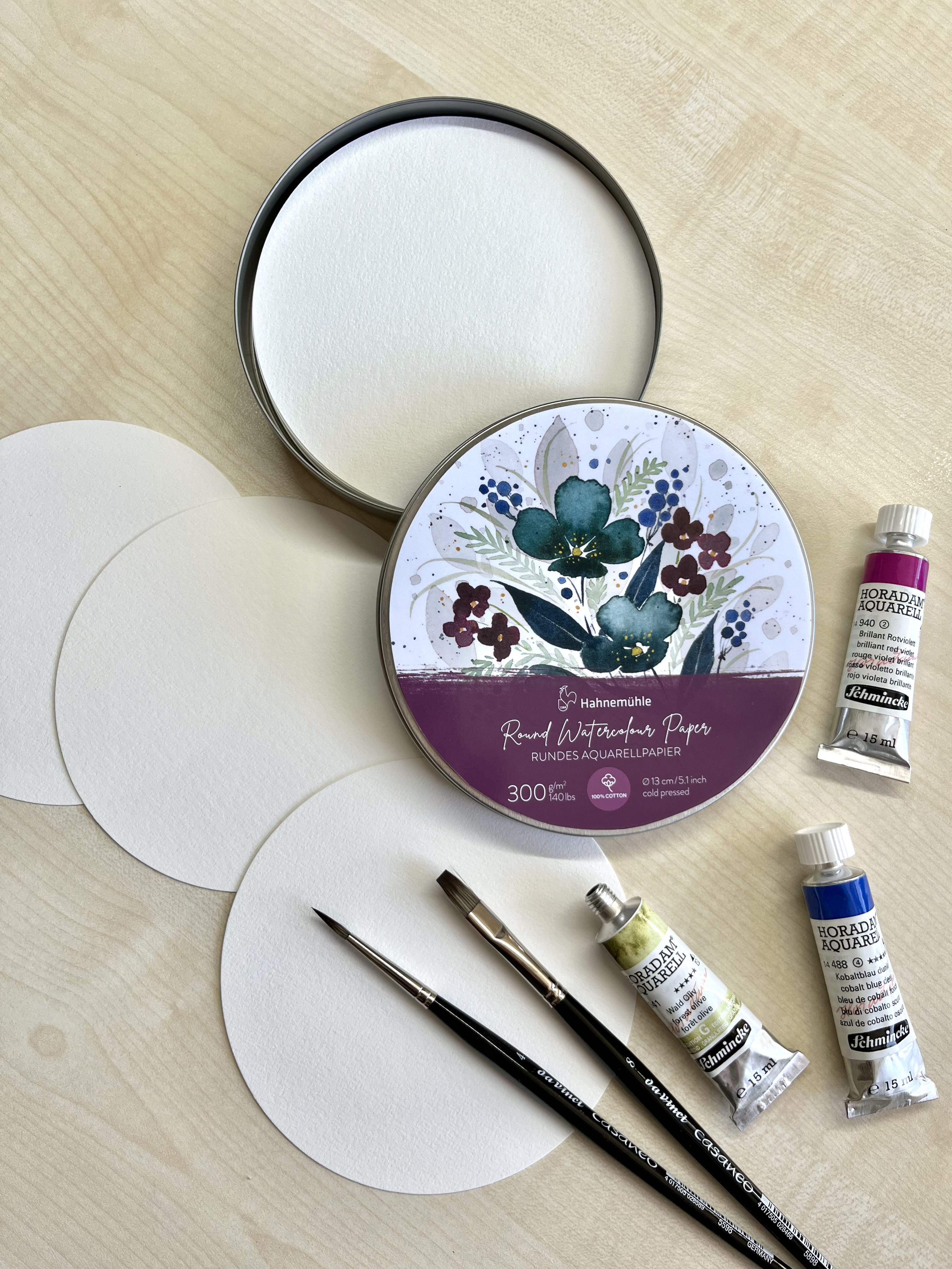 Честитки и картички со уникатна форма, мини-слики со живописни цветови, прекрасни пејзажи, далечни галаксии – сите овие мотиви можете да ги насликате на Hahnemühle Round Watercolour Paper. Кружната акварел хартија ги предизвикува уметниците да излезат од нивната комфорна зона и да размислуваат пошироко и пофлексибилно. Атрактивната метална кутија содржи 30 кружни акварел листови – на врвната Expression watercolour од 100% памук, 300 грама, 13 сантиметри во дијаметар. Хартијата е соодветна не само за акварел, туку и за акрил и гваш како и комбинација на водени техники. Боите на оваа хартија особено се истакнуваат и изгледаат навистина уникатно. Како и преостанатите Hahnemühle хартии, кружната акварел хартија е веганска, без киселини и долготрајна.