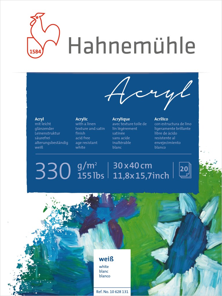Acrylic Paint Board 330 & 450 е хартија со природна бела боја специјално дизајнирана за сликање со акрил, без киселини и долготрајна. Хартијата има лесна завршна обработка од филц која ги апсорбира боите и дозволува повеќеслојна апликација без страв дека боите ќе ја изгубат нивната сјајност. Природната бела хартија е направена од 100% дрвна маса, а блокот е залепен од четирите страни за да се осигура дека ќе остане рамен додека е влажен. Без киселини и со загарантирана долговечност.