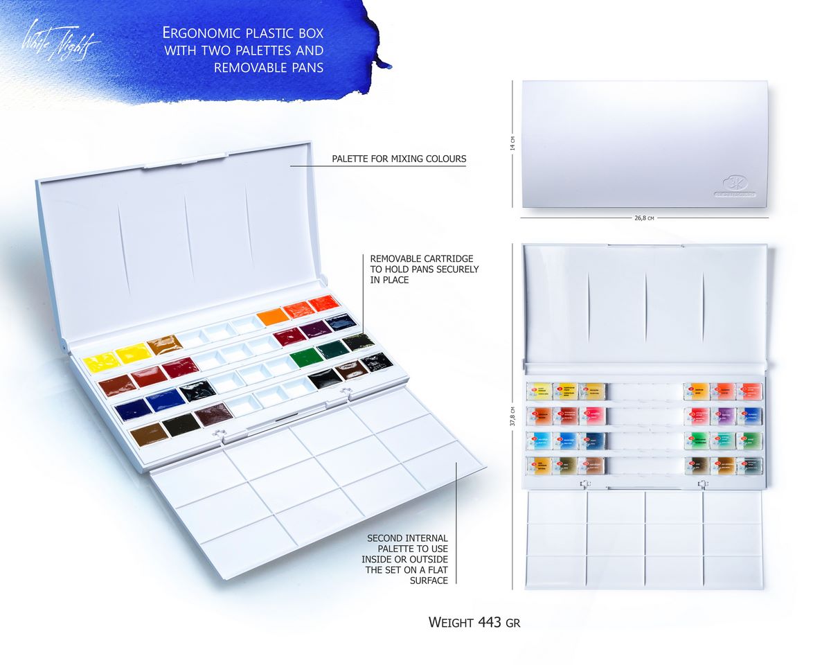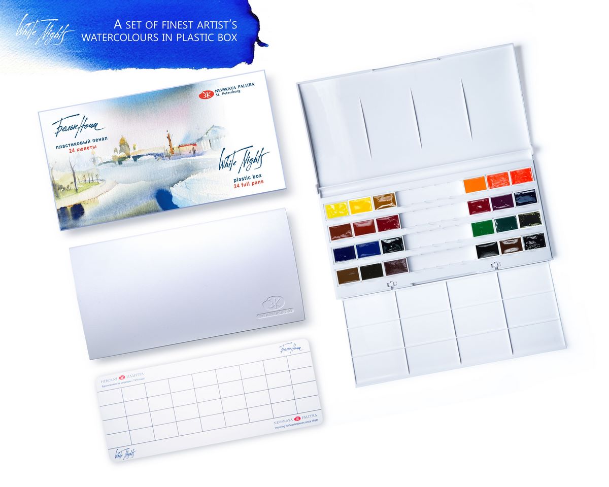 Класичен сет на акварелните бои „Бели ноќи“ (White Nights) – серија наменета за професионални уметници. Сите бои во сетот имаат максимална издржливост на светлина, а повеќето бои се монопигментирани. Боите се направени од висококвалитетни ситнозрнести пигменти и природна гума арабика како врзивно средство. Високата концентрација на пигменти овозможува максимален интензитет на боите. Чистите, реални бои, блиски до спектралните, овозможуваат тие да се мешаат и да се добие богата разновидност на различни нијанси.