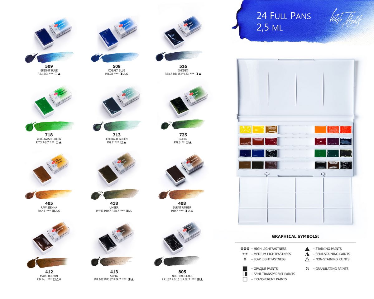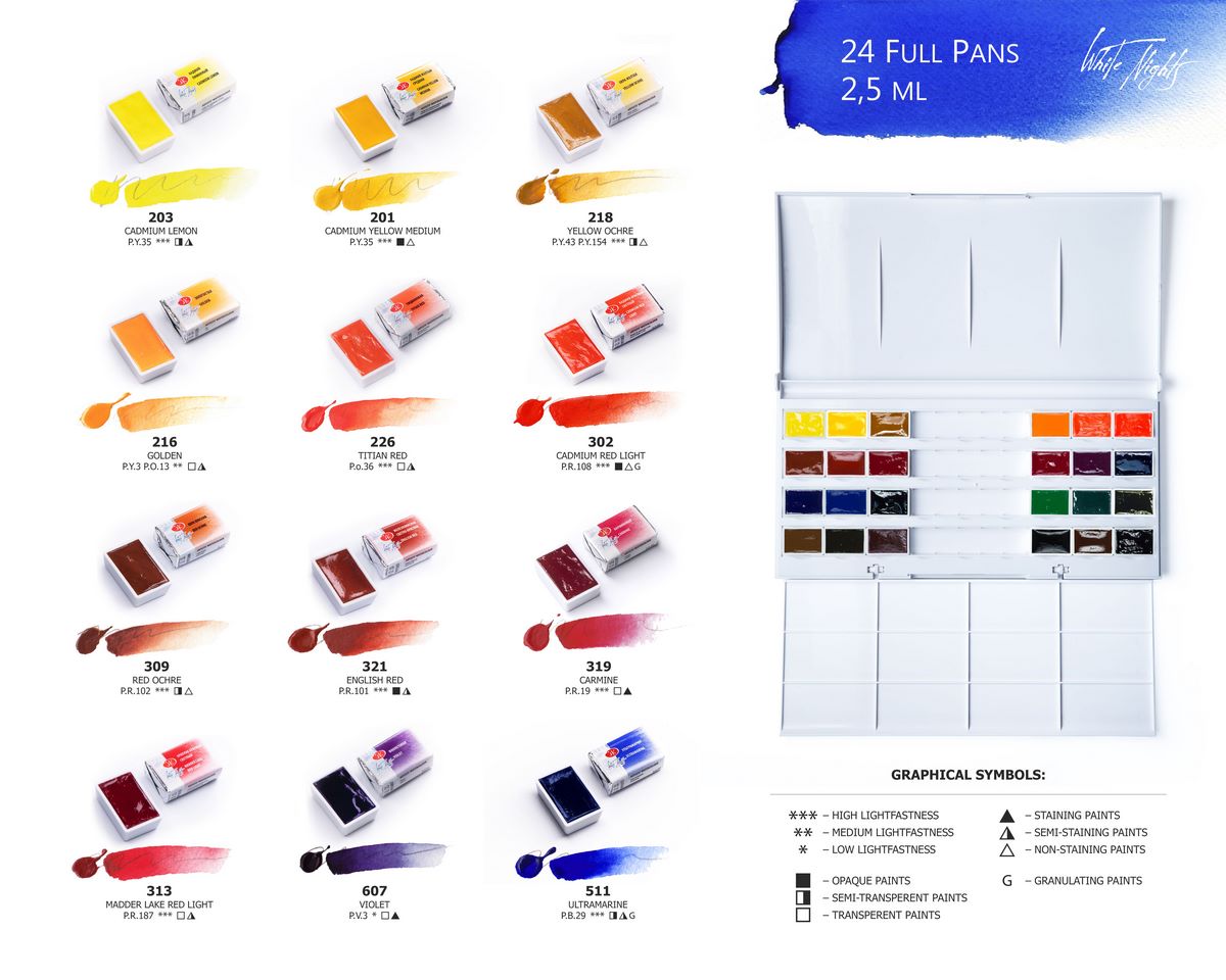 Сите акварели во палетата „Бели ноќи“ се нетоксични, сертифицирани и ги исполнуваат стандардите ASTM D-4236.