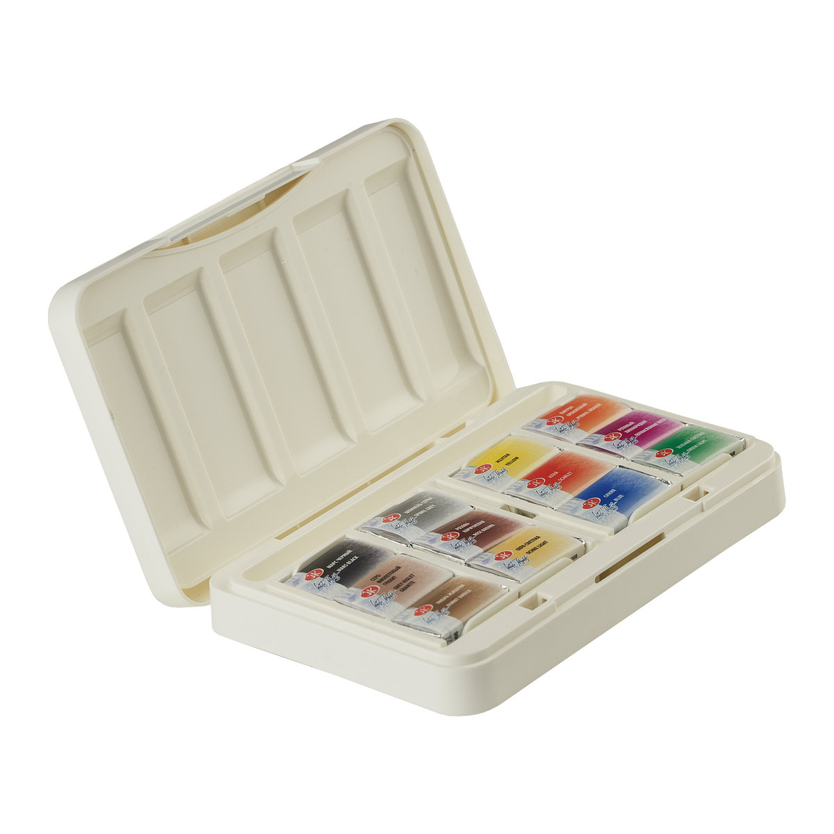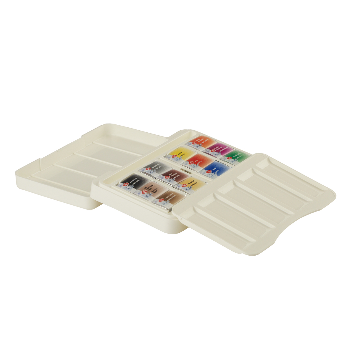 Пластичната кутија со ергономски облик е погодна за работа надвор. Боите се цврсто фиксирани и нема да испаднат ако кутијата се преврти. Кутијата има преграда за четка за патување и две пространи палети за мешање.